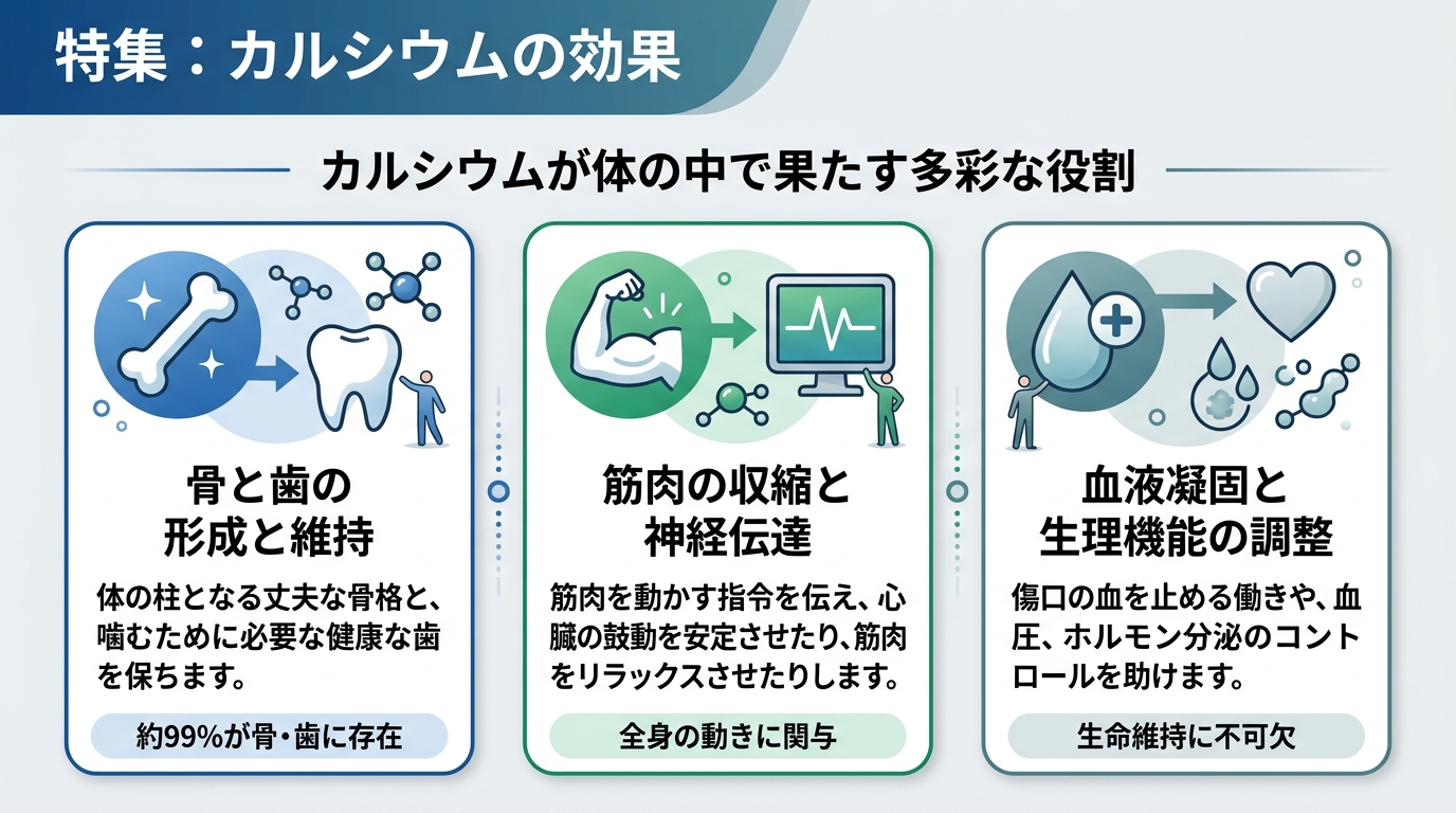 この1%という一見少量のカルシウムが、体内の多くの重要な生理機能を担っています。具体的には以下の通りです。