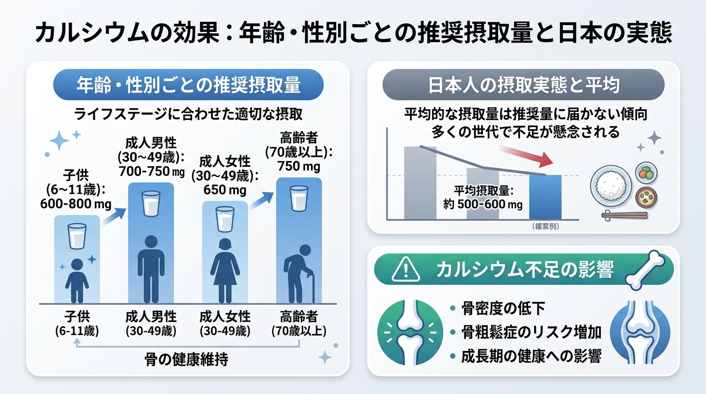 カルシウムの必要量は年齢や性別によって大きく異なります。日本人の食事摂取基準(2025年版)に基づく1日の推奨量は以下の通りです。