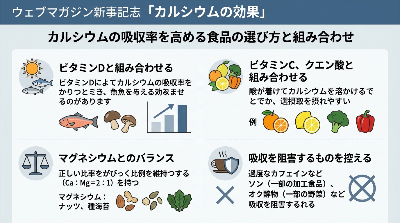 カルシウムは「何mg摂ったか」だけでなく、「どの食品から・何と組み合わせて摂ったか」まで意識することで、実際に体に取り込まれる量を大きく改善できます。ビタミンDを含む食品をカルシウム食品と合わせて献立に組み込む習慣が、日常的な対策として有効です。